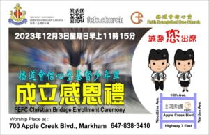Faith EFC, located in Markham, north of Toronto, strives to spread the gospel in the Chinese community. It is our hope that more and more people are coming to know the Lord Jesus Christ, the wonderful Saviour. Through faith, may every seeker of truth receive the gift of eternal life and fill with all joy and peace.