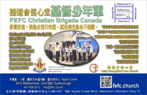 - FEFC Christian Brigade Canada 2025 EnrollmentFEFC Christian Brigade Canada播道會信心堂基督少年軍 Train up a child in the way he should go and when he is old he will not depart from it. 教養孩童, 使他走當行的道, 就是到老他也不偏離。 主旨 Theme 年齡 Age: G3-G10日期 Date: Every Sunday September 14, 2025 – June 14, 2026時間 Time: 10.30 am – 12:30 pm地點 Location: 700 Apple Creek Blvd, Markham,… Read more: FEFC Christian Brigade Canada 2025 Enrollment