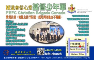 - 播道會信心堂基督少年軍 2025年招募FEFC Christian Brigade Canada播道會信心堂基督少年軍 Train up a chi… Read more: 播道會信心堂基督少年軍 2025年招募