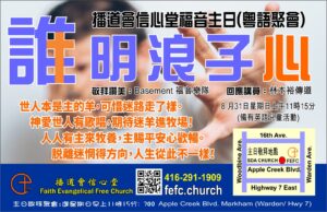 - 誰明浪子心 – 粵語福音主日誰明浪子心 – 粵語福音主日 #福音主日 8月31日為教會福音主日, 主題:“誰明浪子心”。 粵語聚會 / 備… Read more: 誰明浪子心 – 粵語福音主日
